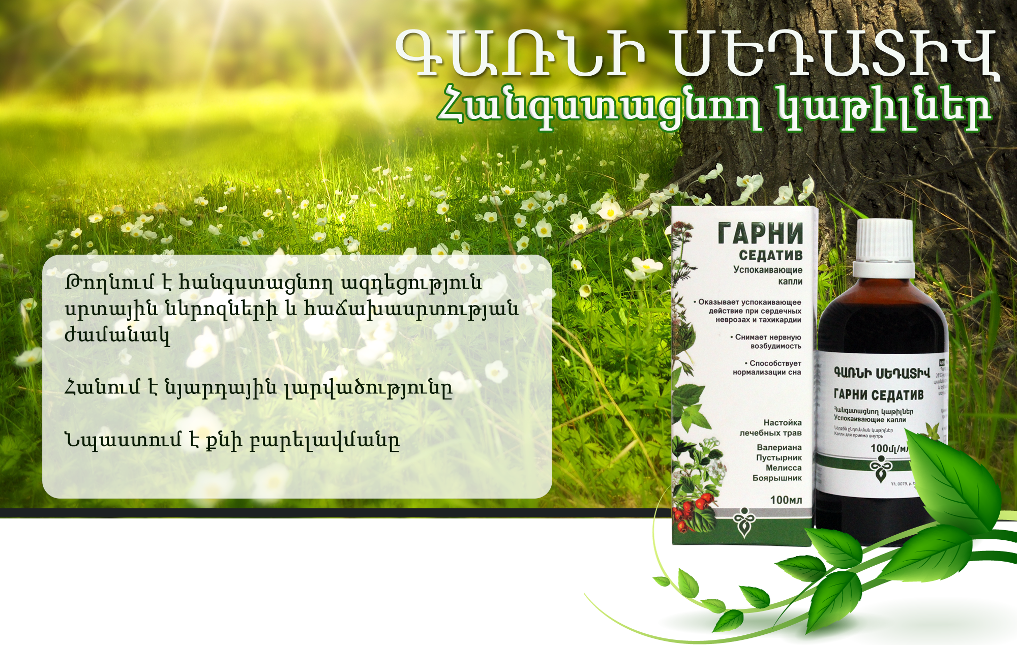Կատվախոտի արմատներ. – Օժտված է արտահայտված հանգստացնող ազդեցությամբ, նվազեցնում է նյարդային համակարգի լարվածությունը, նպաստում է քնի բարելավմանը: